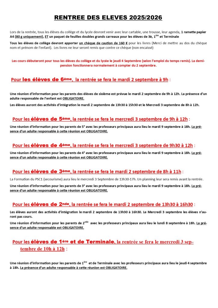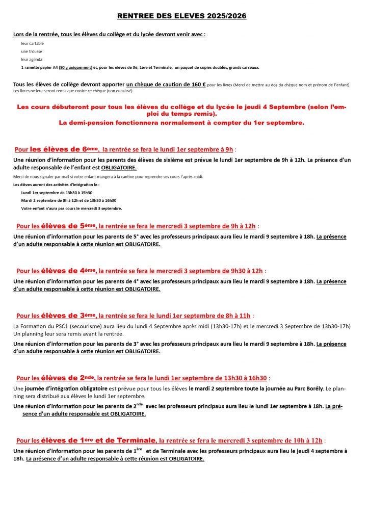 Suite à la décision du préfet de reporter la rentrée à mardi, vous trouverez ci-dessous la nouvelle organisation de la rentrée